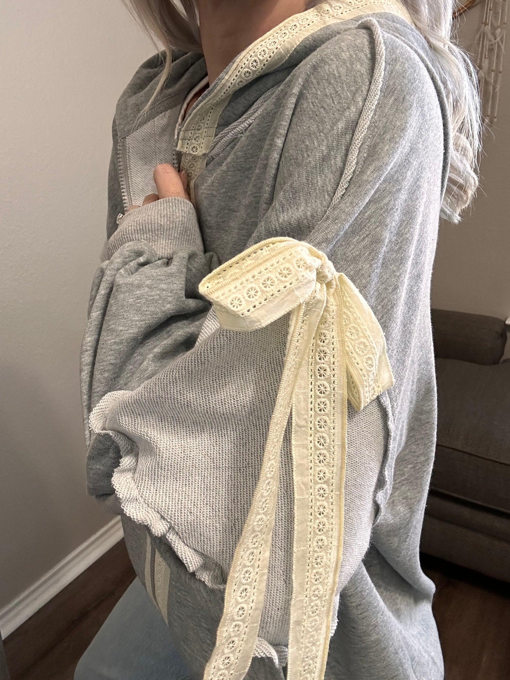 This oversized french terry hoodie blends cozy comfort with dreamy spring charm. Designed with soft balloon sleeves and delicate lace-trimmed ribbon accents, it drapes beautifully while still feeling relaxed and effortless. The lightweight french terry fabric makes it perfect for those breezy transition-season days, and the romantic sleeve detailing gives it a sweet, whimsical finish. It’s the kind of hoodie that feels casual and cozy, yet instantly special — made for slow mornings, coffee runs, and soft spring days ahead.