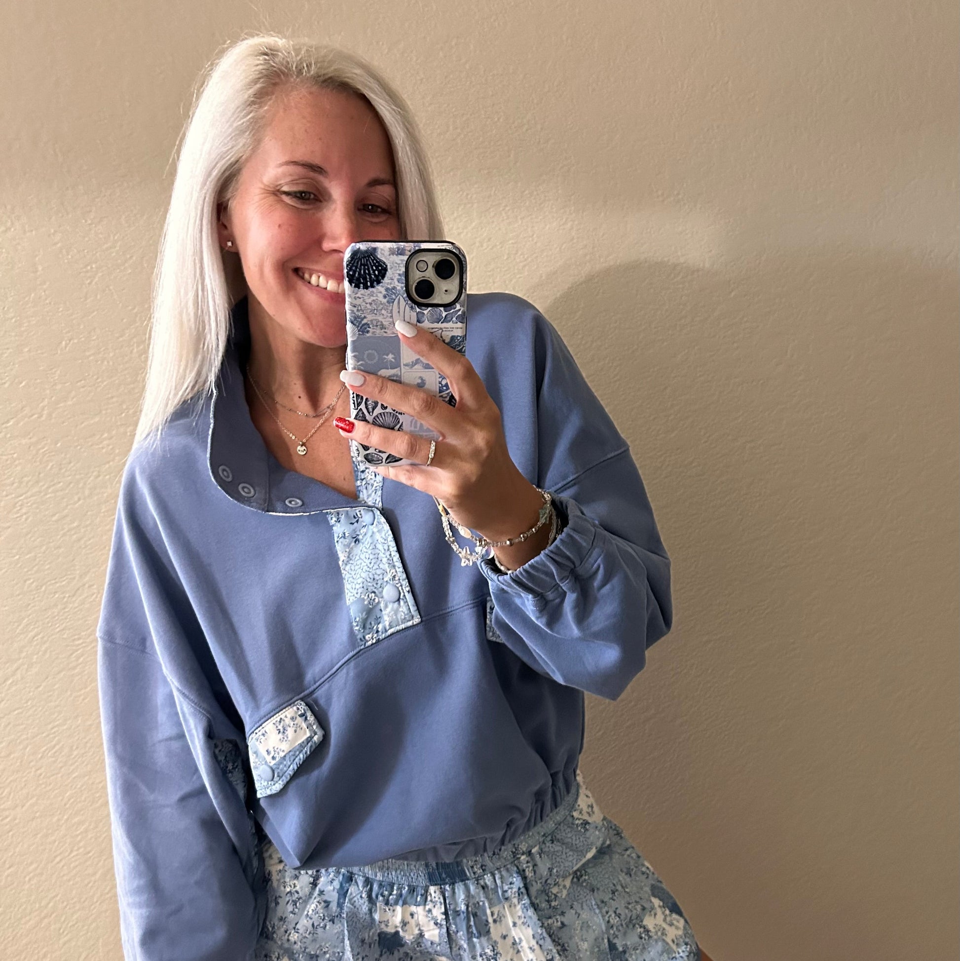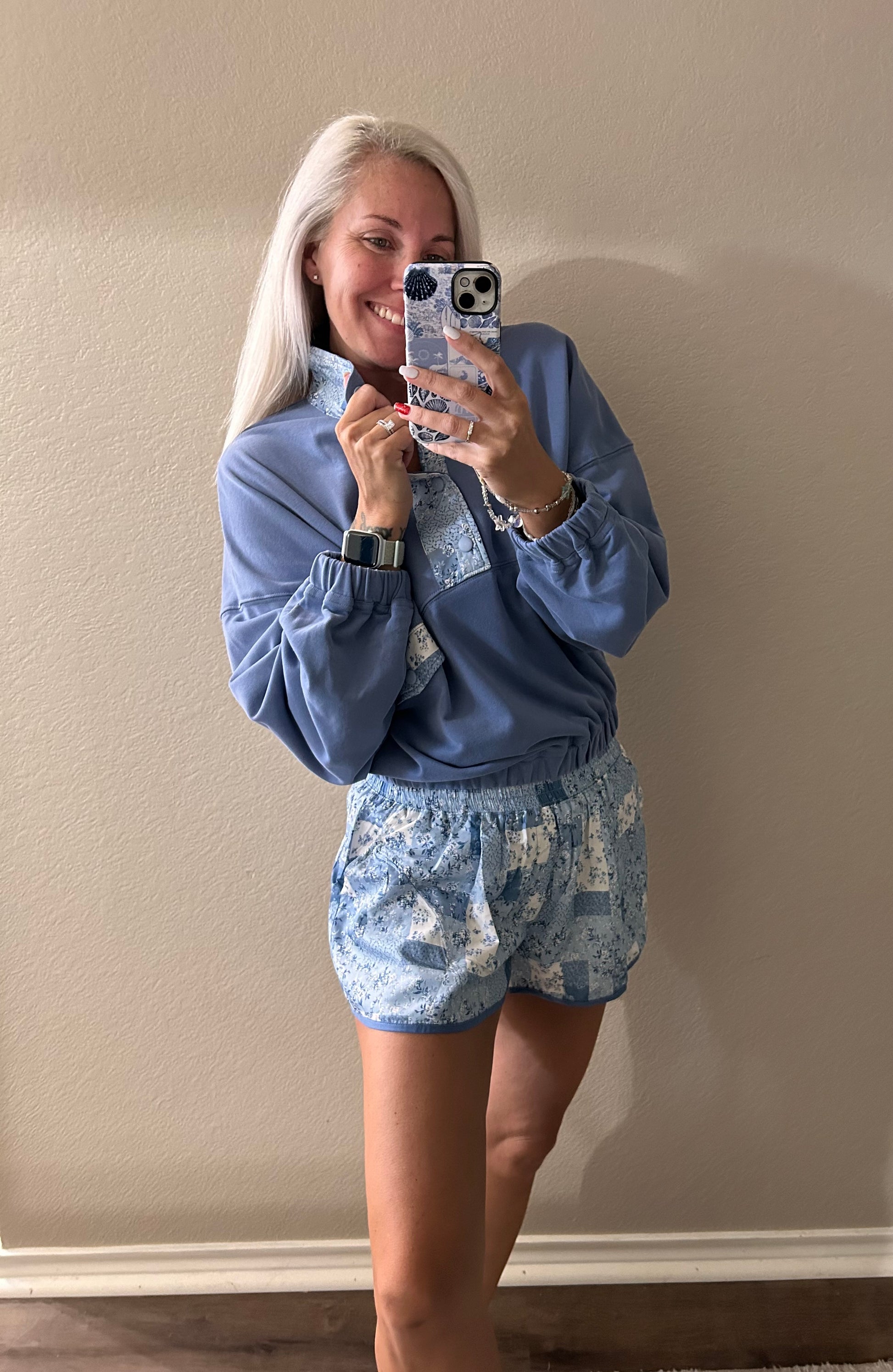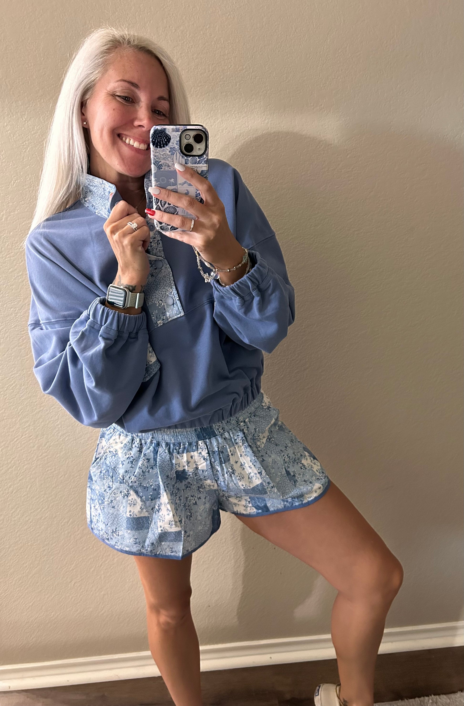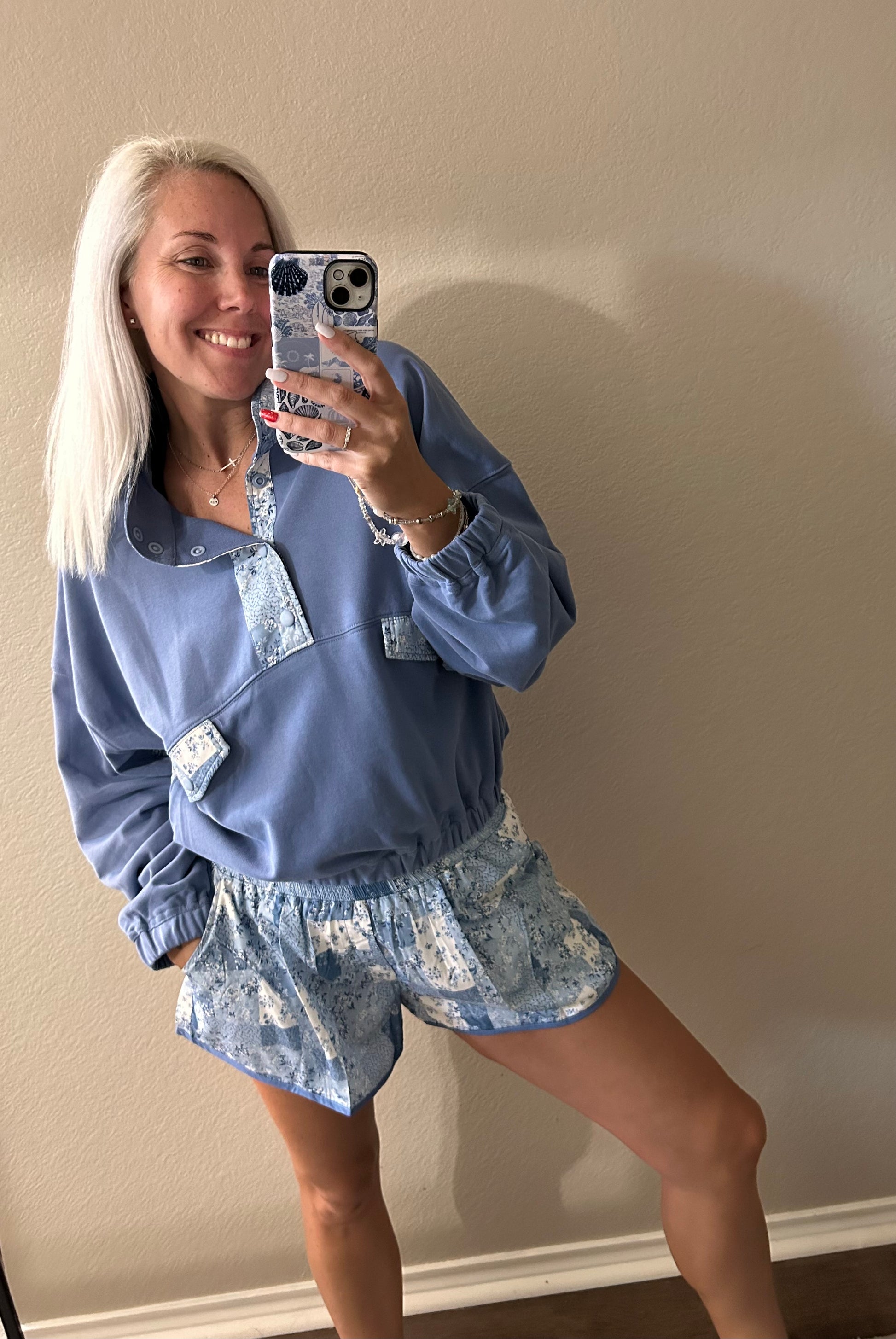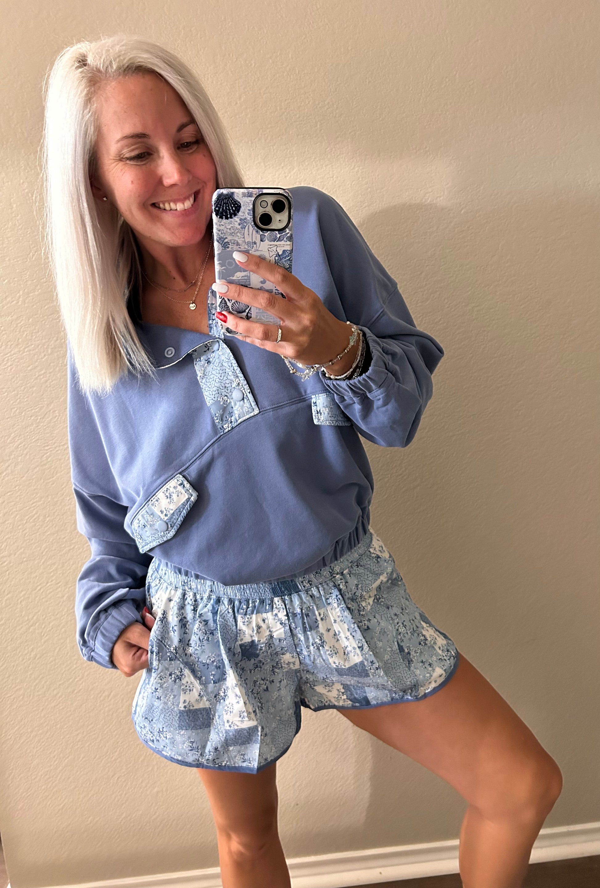 ✨ Meet the Bluebell Patchwork Set – your new go-to for cozy days and carefree vibes! This two-piece features a soft baby loop terry pullover with a button-up neckline, contrast floral patchwork placket, and relaxed drop-shoulder fit. The matching shorts bring all the charm with an allover floral patchwork print, high-rise elastic waistband, roomy fit, and side pockets (because pockets are always a win!).