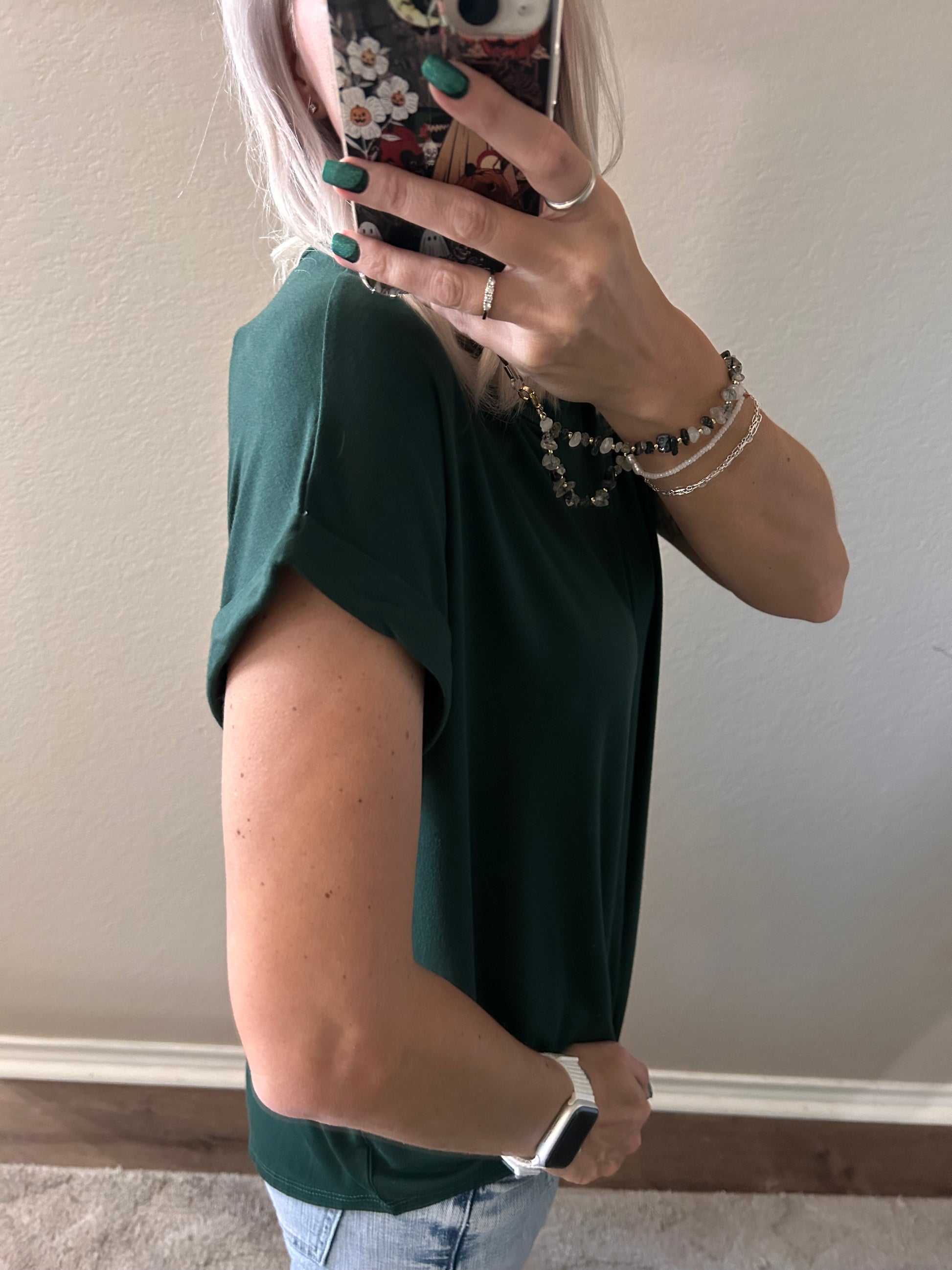 Simple, soft, and effortlessly chic — the Evergreen Forest Trail Tee is your new everyday go-to. With its relaxed fit, cuffed sleeves, and silky drape, it’s the perfect blend of comfy and cute. Dress it up with gold jewelry or keep it casual with denim for an easy fall look.