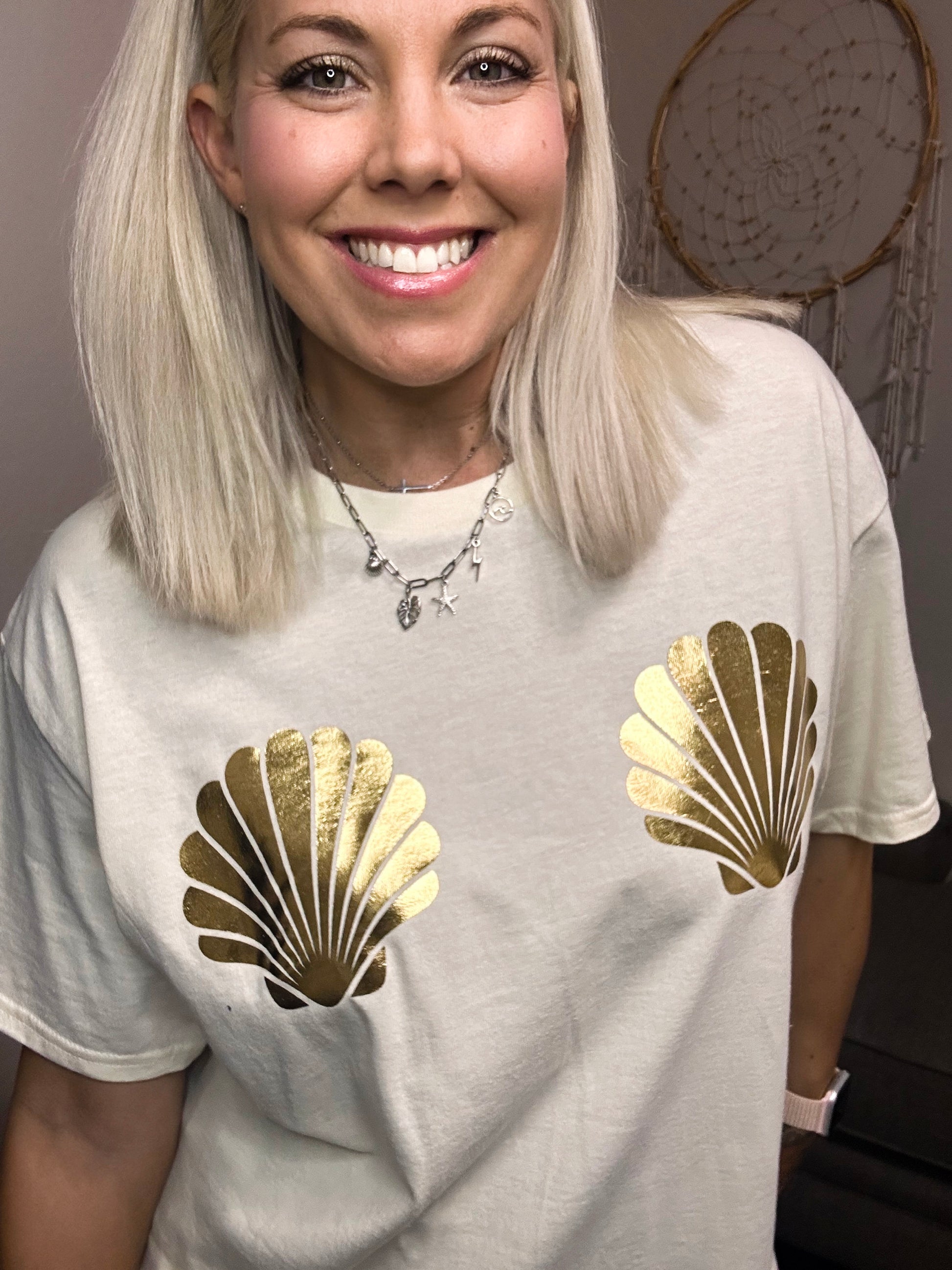 Make a splash with standout style! Our Metallic Shells Oversized Tee features bold double gold foil seashell graphics on a comfy oversized fit — perfect for channeling your inner sea goddess. Whether you're tossing it on as a swimsuit cover-up or pairing it with biker shorts, this tee adds whimsy and shine to any look.