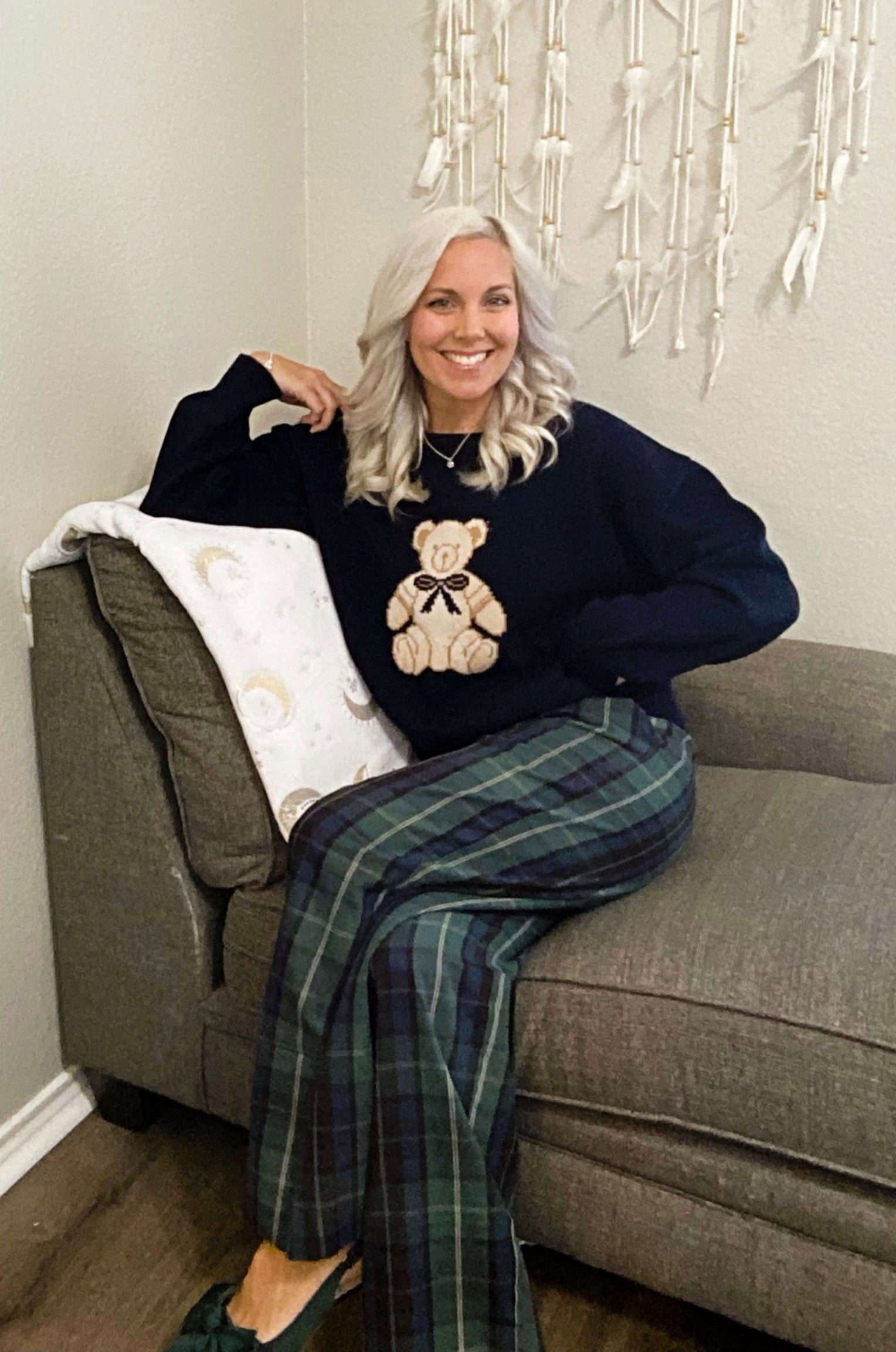 Wrap yourself in cozy charm with the Nightfall Teddy Sweater — a soft jacquard knit pullover that’s as sweet as it is stylish. Featuring an adorable teddy bear motif with a dainty bow, this relaxed-fit sweater brings all the nostalgic feels. Designed with a round neckline, drop shoulders, and comfy knit texture, it’s the perfect blend of cozy and cute for chilly days, holiday outings, or fireside lounging.