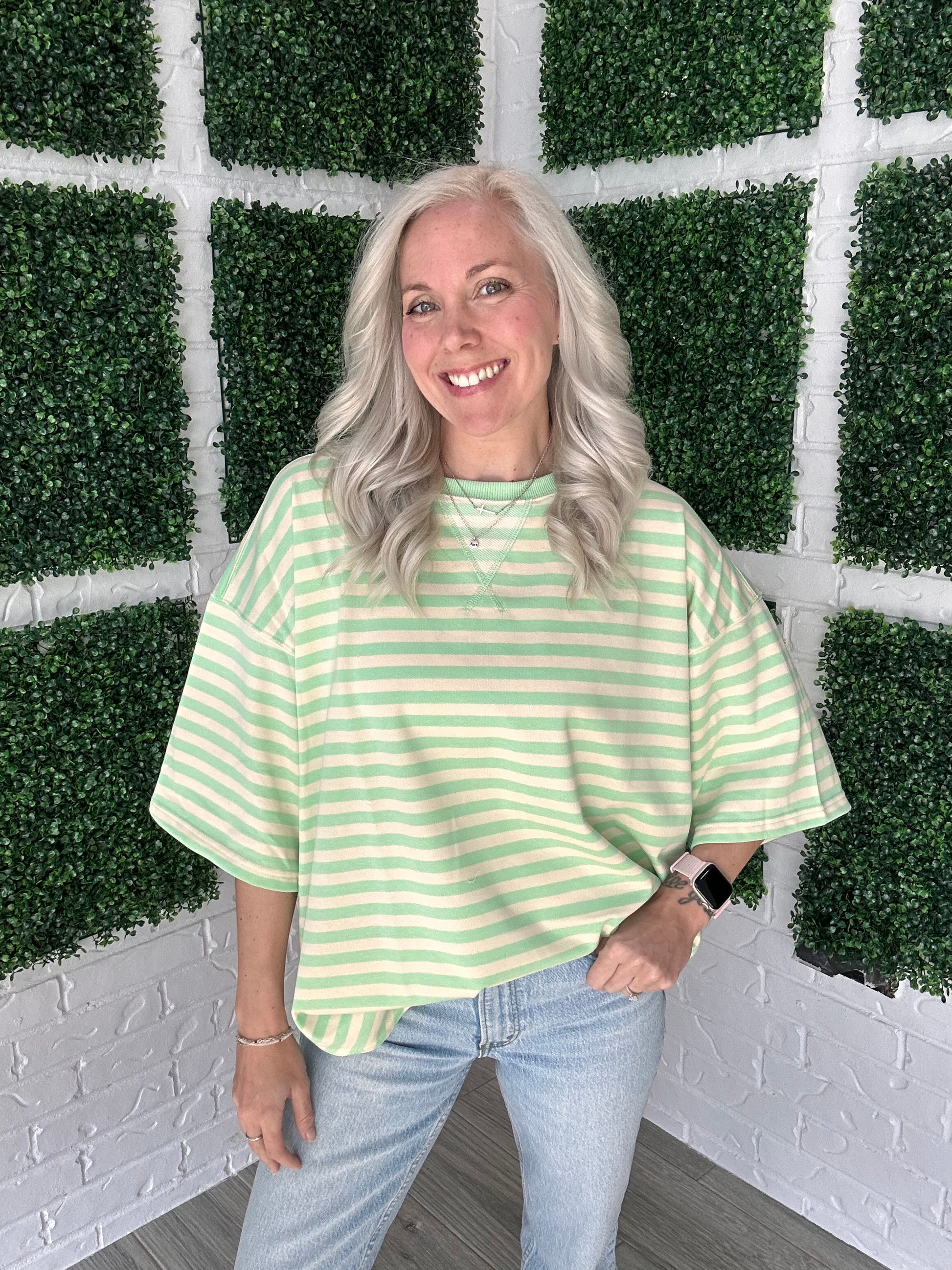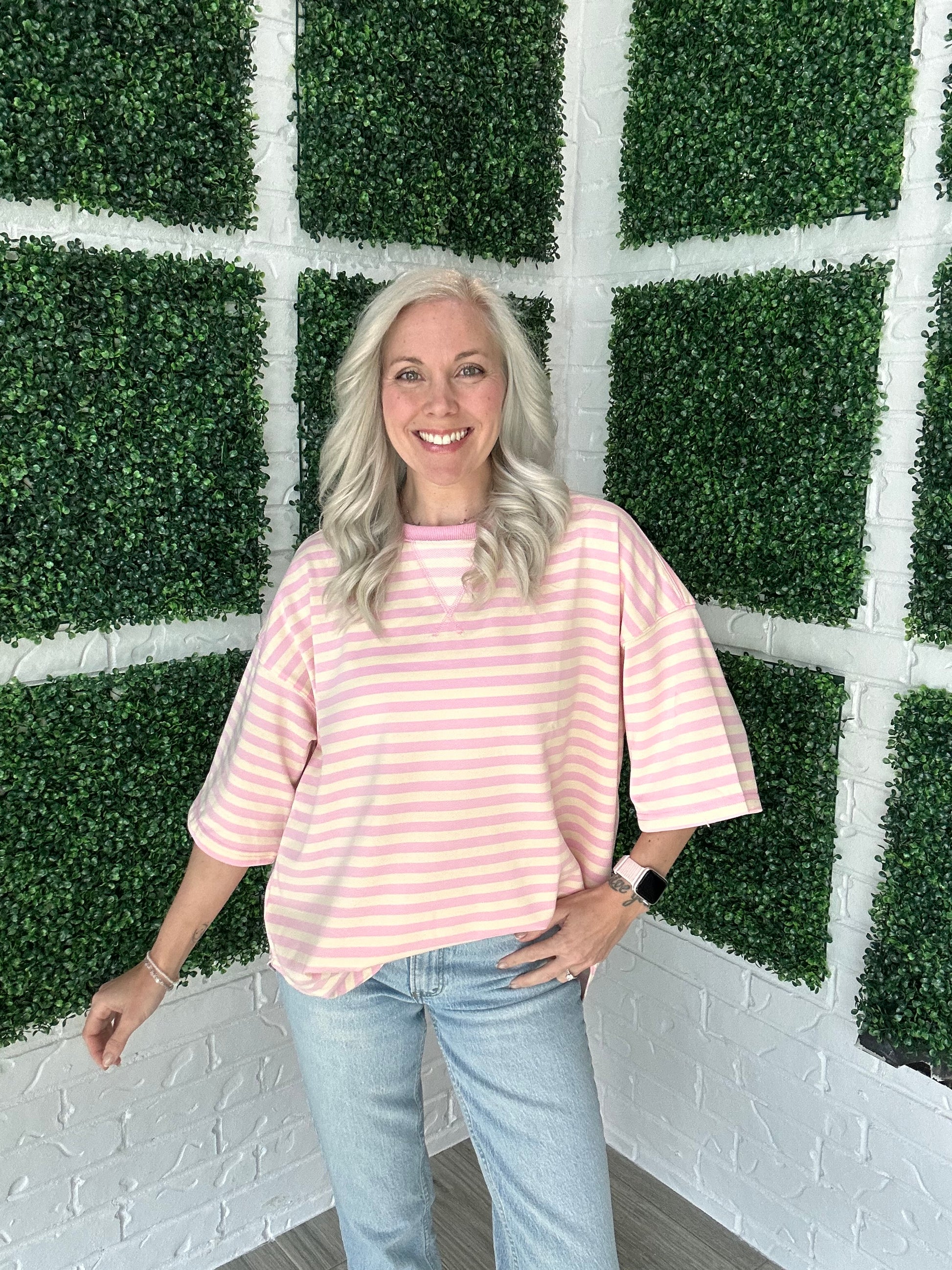 Easy stripes and a relaxed silhouette give the Prairie Stripe Oversized Top its soft countryside charm. Designed with a lightweight feel and loose, flowy shape, this piece captures that effortless throw-on style that still feels thoughtfully styled. The classic round neckline is finished with a subtle V-stitch detail for added texture, while oversized short sleeves and a rounded hem create a comfortable drape that moves naturally. Calm, casual, and endlessly wearable, this top brings a gentle prairie-inspired feel to everyday dressing.