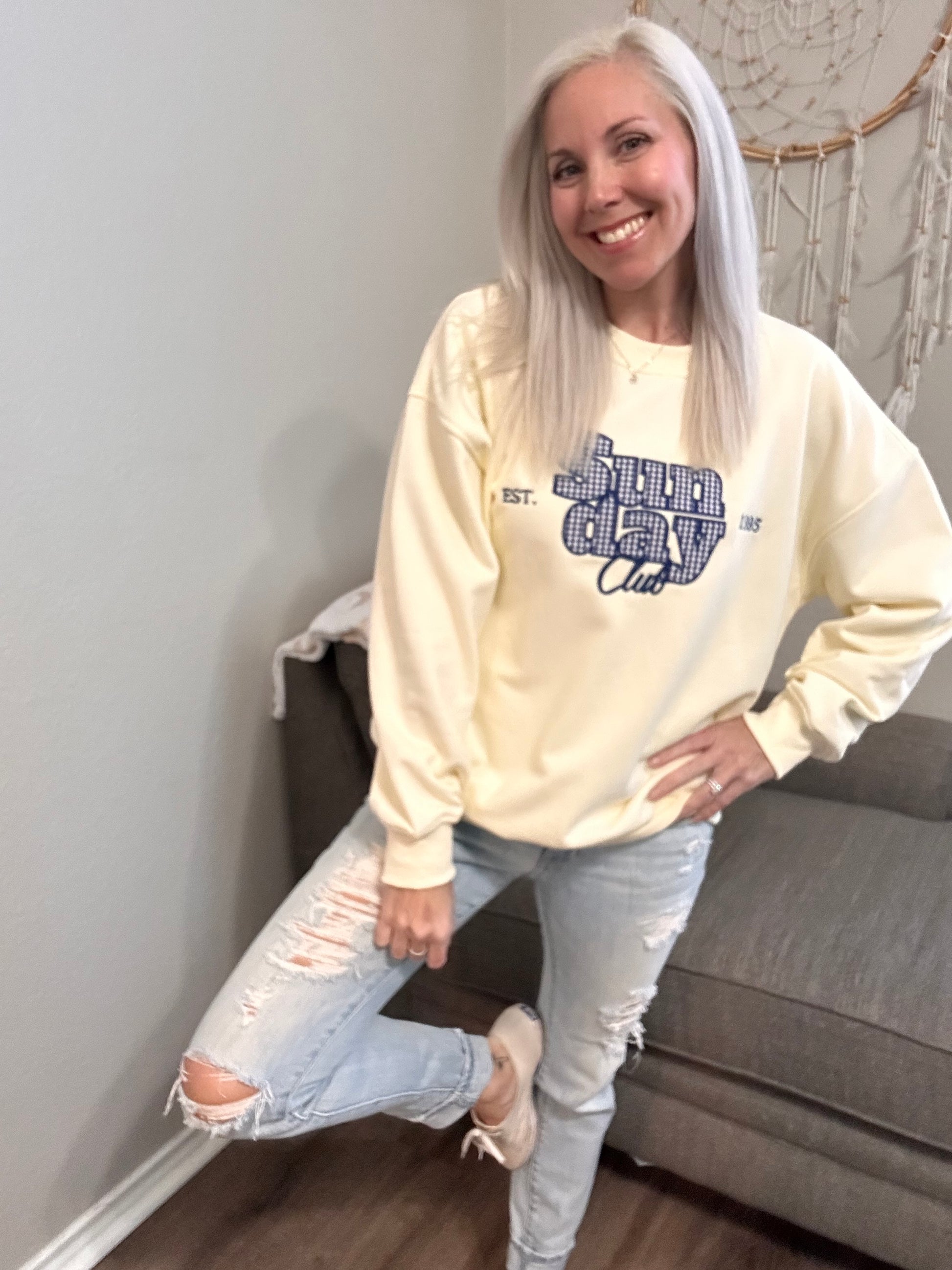 Meet your new cozy-cute weekend favorite — the Sunday Club Sweatshirt. Featuring a charming blue gingham embroidered Sunday Club patch, this pullover blends retro prep with laid-back lounge vibes. Made from a soft cotton-poly blend, it’s comfy, lightweight, and perfect for coffee runs, casual days, or slow Sunday mornings.